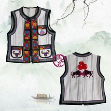 黑色棉麻小单裤粗棉布男童马甲套装白族彝族十字绣花边小帆布马褂