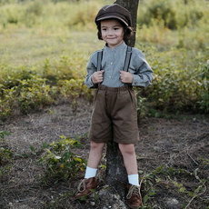 秋季西班牙长袖男童白色纯棉上衣+卡其棉麻短裤套装生日周岁礼服