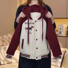 安可拉红夹棉棒球服女童秋冬新款洋气拼色绗棉加厚连帽夹克棉服潮