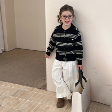 中大儿童时髦复古学院风条纹翻领毛衣女童秋冬装加厚保暖针织上衣