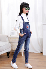 B春秋款童装 女童刺绣卡通黄字母裤脚深印背带牛仔裤 D1B