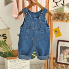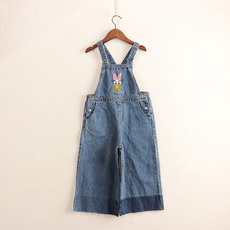 新夏款熊兔卡通刺绣春秋款牛仔背带长裤/七分裤
