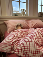 ins水洗棉混搭红色细条格子床单床上四件套全棉1.5m1.8被套三件套