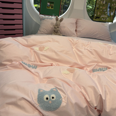 日系100s高支纯棉磨毛刺绣贪吃猫深蓝色四件套1.5m1.8米床上用品