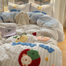 小清新卡通毛巾绣水洗全棉四件套 ins条纹格子纯棉床品宿舍棉床单