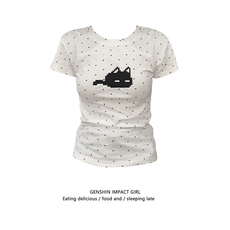 波点小众猫咪印花正肩短袖t恤女夏季新款甜辣妹圆领显瘦纯棉上衣