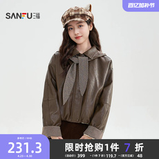 三福咖色皮衣2025新款冬季韩系可拆帽子格子翻边袖外套女装512068