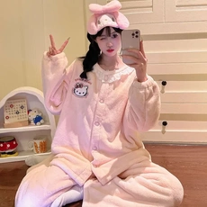 法兰绒睡衣女秋冬季新款可爱日系卡通加绒加厚开衫长袖家居服套装