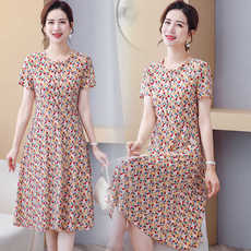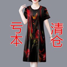 新款中老年妈妈装印花连衣裙女遮肚子冰丝连衣裙夏时尚洋气中长裙