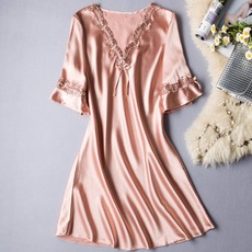 睡衣女夏柔软丝绸睡裙性感蕾丝绣花睡裙家居服睡衣短袖冰丝连衣裙