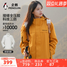 企鹅户外冲锋衣女三合一外套2025秋季新款防风防暴雨登山服远山蓝