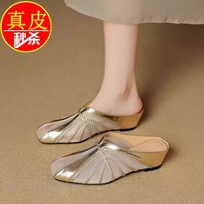 真皮外穿厚底包头半拖鞋女2025春夏新款磨砂坡跟松糕底水钻凉拖女