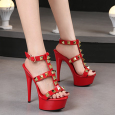 2025夏季新款凉鞋女高跟鞋细跟防水台性感露趾铆钉真皮恨天高13CM