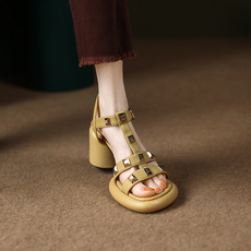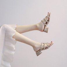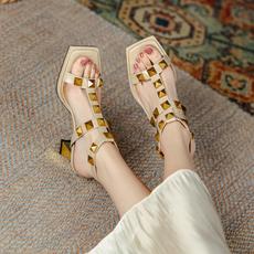 铆钉包头罗马凉鞋女粗跟2025年夏季新款仙女风中跟百搭大码41到43