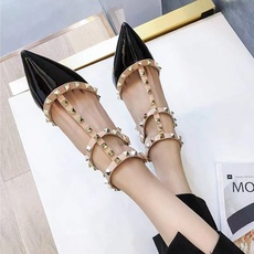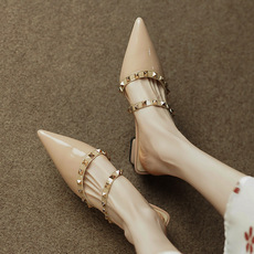 铆钉凉鞋女尖头一字带平底鞋2025年夏季漆皮柳丁低跟包头粗跟单鞋