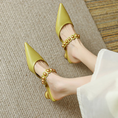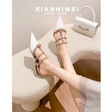 铆钉尖头高跟鞋女细跟2025夏季新款包头一字带凉鞋百搭女士半拖鞋