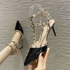 LUKE2025夏季新款时尚尖头V家铆钉高跟凉鞋女三环一字扣带鞋女