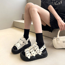 2024夏季新款复古真皮露趾铆钉凉鞋女粗跟厚底防水台高跟罗马凉鞋