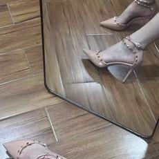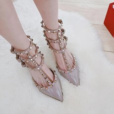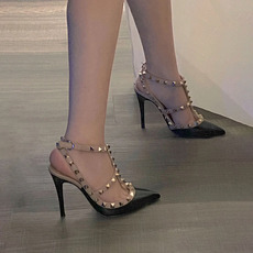 欧美尖头铆钉高跟鞋细跟一字扣带凉鞋女夏仙女风柳丁中跟单鞋婚鞋