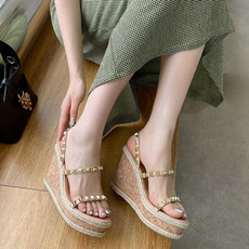 圆头露趾防水台坡跟凉鞋女夏季新款皮带扣铆钉高跟搭扣时装凉鞋