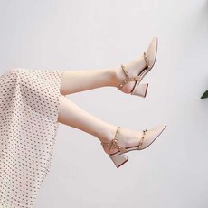 2025年新款春夏季低跟铆钉单鞋女凉鞋仙女尖头粗跟裸粉色女鞋大码