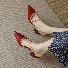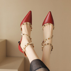 今年牛皮包头凉鞋2023年新款女中跟尖头后空粗跟夏铆钉高跟鞋