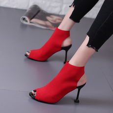 欧美鱼嘴鞋露趾凉鞋女2025夏季新款真皮细跟松紧弹力罗马高跟凉靴