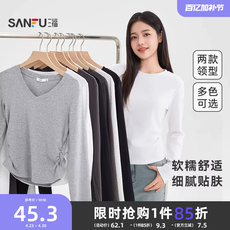 三福打底衫女2026新款春季简约纯色收腰V领修身休闲长袖上衣女装