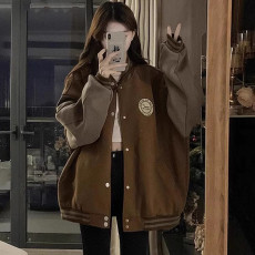 美式复古鹿皮绒三条杠夹克外套女春秋拼接独特宽松情侣开衫棒球服