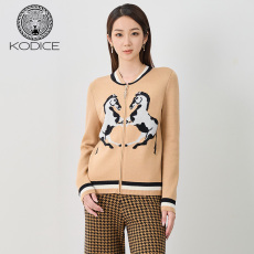 kodice秋冬新品女装驼色绵羊毛混纺棒球服拉链提花针织外套开衫