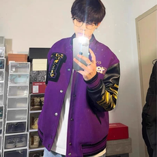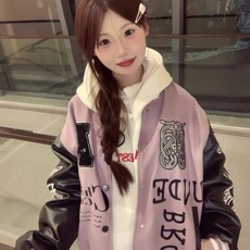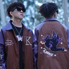 春秋欧美高街男女紫色夹克刺绣情侣装棒球服炸街拼接小众机车外套