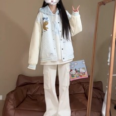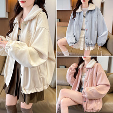 趣味刺绣麂绒皮羊羔毛冬季新款宽松百搭慵懒风休闲夹克棒球服上衣