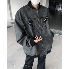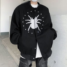 春秋美式蜘蛛刺绣pu皮夹克男女款拉链休闲宽松百搭街头棒球服外套