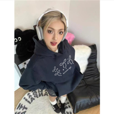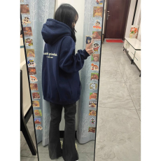 高端即墨大牌纯棉卫衣女秋冬简约慵懒风藏青印花t恤加绒加厚外套