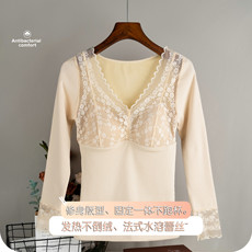 长袖打底衫带胸垫冬季低V领性感蕾丝修身加绒加厚保暖内衣女上衣