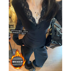 MosesQueen魔西女王加绒加厚蕾丝v领长袖女冬内搭修身打底衫上衣