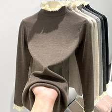 半高领磨毛加绒保暖上衣女秋冬新款洋气加厚蕾丝打底衫女内搭长袖