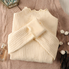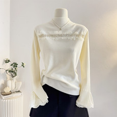 半高领蕾丝拼接木耳边长袖针织衫女秋冬新款内搭加绒加厚打底上衣