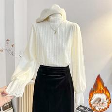 半高领蕾丝衫加绒加厚衬衫女秋冬洋气内搭打底植绒提花小衫上衣杏