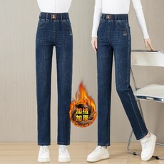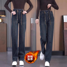 松紧腰加绒加厚牛仔裤女直筒宽松高腰显瘦大码垂感修身妈妈长裤