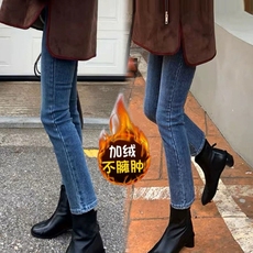 2025新款秋冬修身九分微喇牛仔裤女加绒加厚复古高腰弹力显瘦长裤
