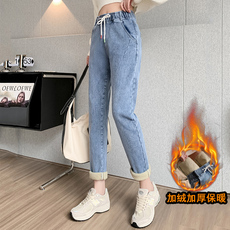 加绒牛仔裤女冬季加厚松紧腰弹力哈伦直筒学生小个子显瘦老爹裤子