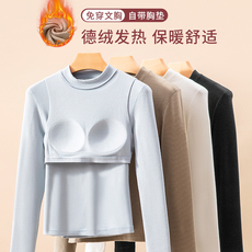 带胸垫德绒打底衫女秋冬内搭加绒磨毛秋衣大码加厚防寒圆领上衣