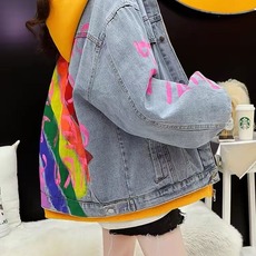 加绒加厚连帽牛仔外套女秋冬妈妈装新款韩式印花长袖宽松休闲夹克