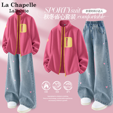 拉夏贝尔女童套装2025新款奥粒绒外套加绒牛仔裤儿童冬装女孩衣服