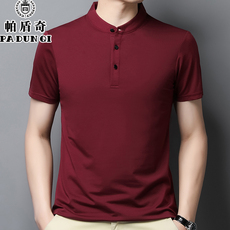 丝光棉扣子立领短袖t恤男酒红加肥加大码男装潮胖子体桖夏装上衣
