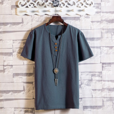 夏季薄款亚麻短袖T恤衫中老年男宽松版加肥加大棉麻休闲老头衫