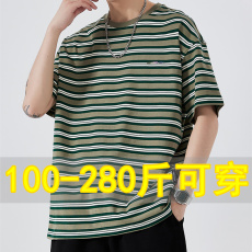 夏季潮男胖子宽松休闲日系条纹圆领纯棉短袖t恤加肥加大肥佬半袖