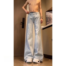 浅蓝色美式软牛仔裤男款夏季宽松阔腿裤子加长款高个子直筒微喇裤