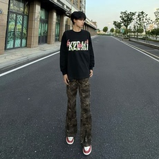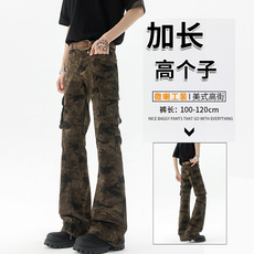 高个子加长版迷彩工装裤男生美式高街弯刀裤窄版直筒微喇牛仔裤潮